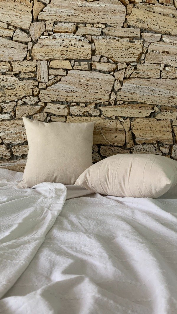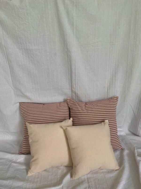 Funda de almohadón de tusor en color crudo, relleno de vellón siliconado.